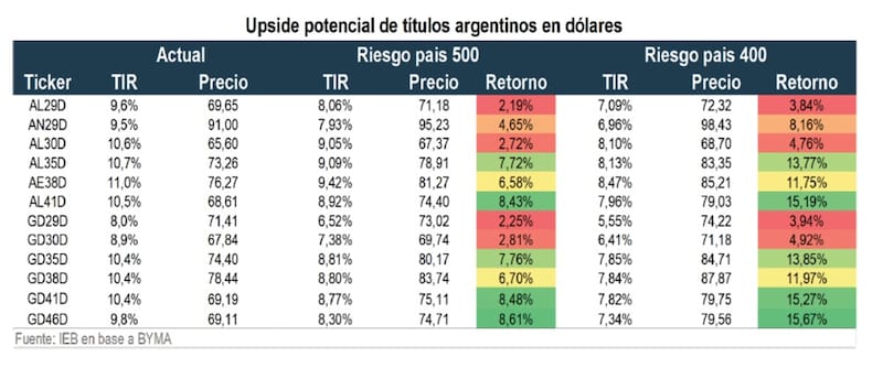 En el caso en que el riesgo país apunte a los 400 puntos, los bonos del tramo corto podrían avanzar entre 3% y 8%. En este caso, el nuevo bono AN29, podría evidenciar una ganancia de 8,1%, según Grupo IEB.
