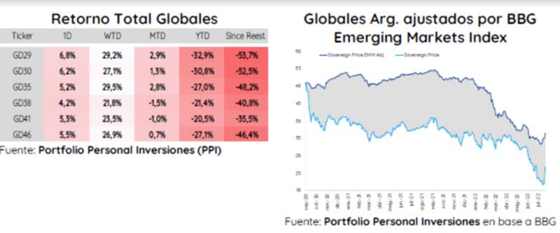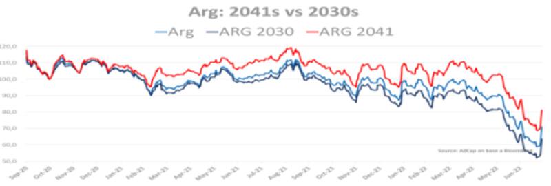 "Las valuaciones de los bonos empiezan a hacer que las recompras tengan mucho sentido, lo que genera un gran impacto sobre la percepción del riesgo, y ya está impactando a nivel precio en los bonos soberanos. Todos los soberanos rebotan parecido, pero el bono 2030 tiene más para subir porque fue muy castigado. Volver al mínimo de marzo sería +30% para el GD30 vs +18% para el GD41".comentaron.