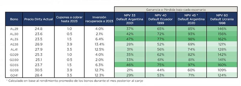 Si el Valor Presente Neto de los nuevos bonos a entregar de cara a la próxima reestructuración en 2024 fuera de u$s 40, las mayores ganancias se observarían en el Global 2035, con rendimientos de más de 150%, al igual que en el Global 2041 y 2046.