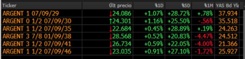 Con esta suba, los rendimientos de los bonos pasaron de niveles de 50% hasta los actuales 38% en el tramo más corto y con un promedio del 22% en el tramo más largo. El avance permitió, además, que los bonos pasen de operar con paridades de 18% al 23% en promedio.