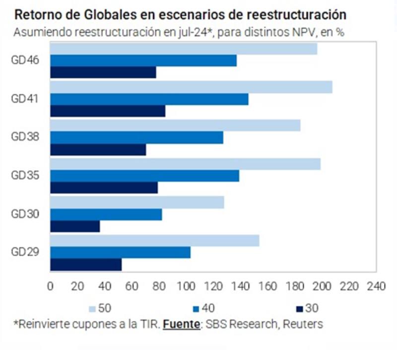 Los actuales precios de los bonos todavía dan cuenta de que el mercado especula con un eventual proceso de reestructuración. Según cálculos de Franco, mirando hacia una eventual reestructuración en 2024 y pensando en un Valor Presente Neto de los nuevos bonos a entregar de 30 dólares, los Globales del tramo medio otorgarían ganancias cercanas al 80%, similar a los Globales a 2041 y 2046.