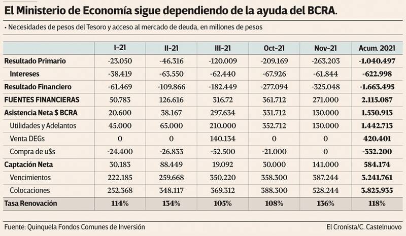 Sin embargo, el alto déficit obligó al Ministerio de Economía a depender de las transferencias de la autoridad monetaria, al punto que en los 11 meses transcurridos de 2021 el impacto monetario bruto de esa asistencia alcanzó el equivalente a 4,3 puntos del Producto Bruto Interno (PBI), según consignó un informe de Quinquela Fondos.
