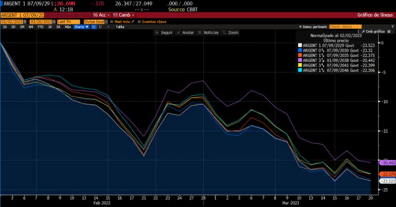 Desde el pico de febrero hasta la fecha, los bonos argentinos muestran un fuerte retroceso, con caídas mayores al 23% en todos los tramos.