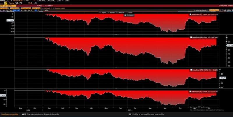 Las acciones de Grupo Financiero Galicia acumulan una baja del 22%, similar a BBVA Argentina que cae 21% desde los máximos.