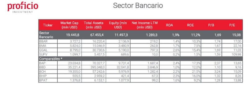 La valuación de mercado de los bancos argentinos suma en total u$s 19.445 millones, con un total de activos bajo administración de u$s 67.455 millones, según un informe elaborado por Proficio Investments.