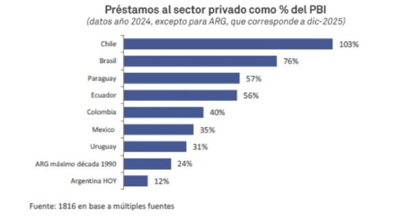 Una de estas métricas es el de prestamos al sector privado como porcentaje del PBI, el cual en Argentina es del 12%. Según la consultora 1816, en 1990 dicha metica era del 24%. Tomando como comparación regional, en Uruguay es del 31%, saltando al 35% en México, 40% en Colombia, 56% en Ecuador, y del 57% en Paraguay.