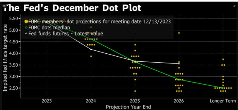 El diagrama de puntos de la Fed (el Dot Plot), apunta a recortes de 75pbs en 2024, es decir, tres bajas de tasas para 2024.