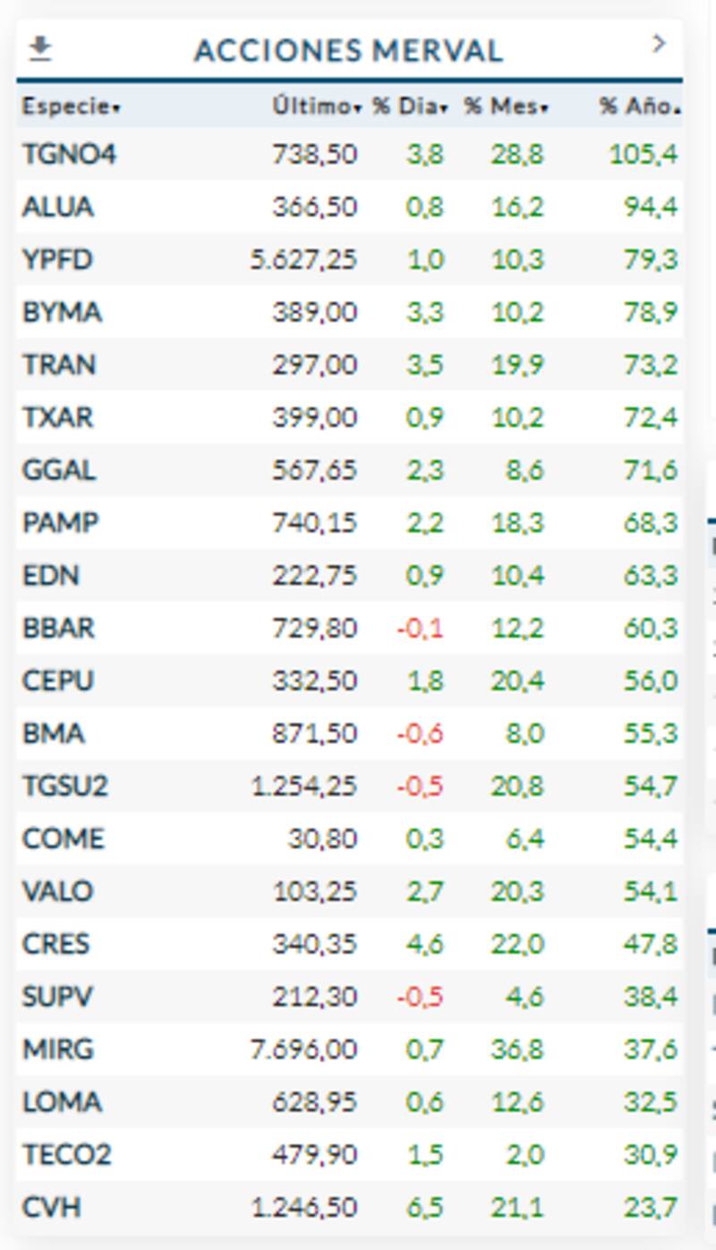 Le siguen BYMA, Transener, Ternium, Grupo Financiero Galicia, Pampa, Edenor, BBVA Argentina, Banco Macro, TGS, Comercial del Plata, Grupo Financiero Valores, Cresud, con subas de entre 47% y 79% en lo que va del año.