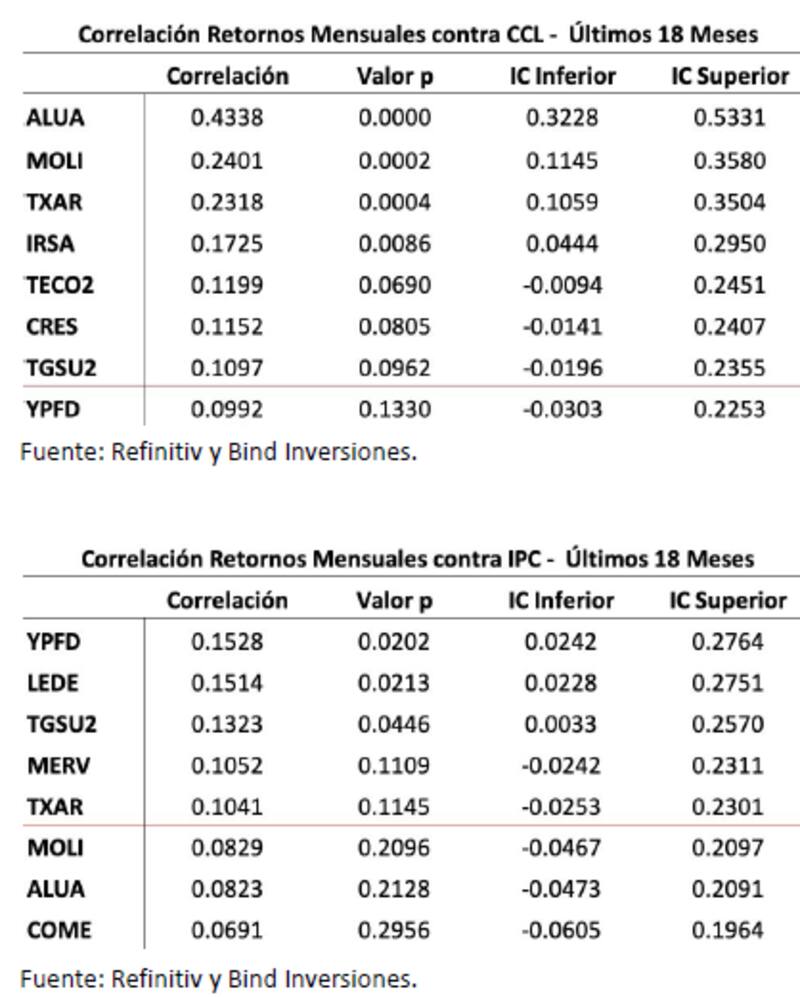 Según sus estudios, entre los papeles que mejor correlación tienen con el contado con liquidación (CCL) se encuentran ALUA, MOLI y TXAR, mientras que los que mejor correlación tienen con la inflación son YPFD, LEDE y TGSU2.