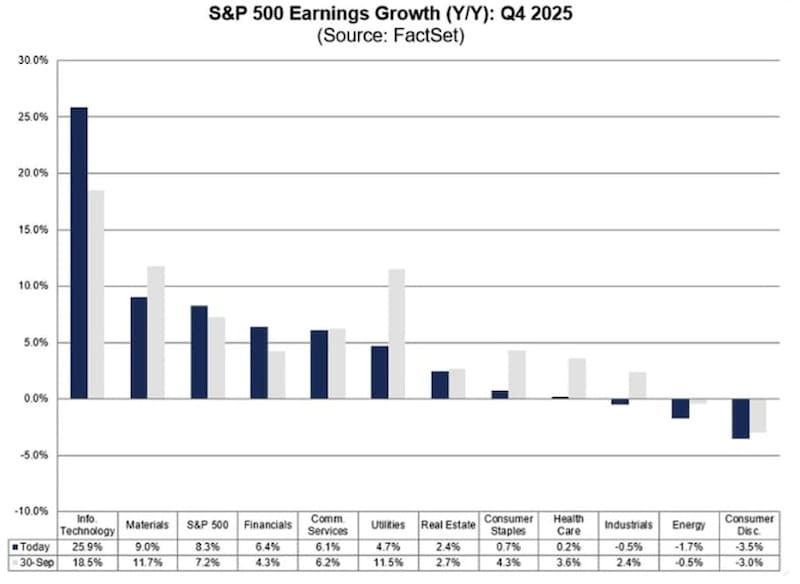 Por otro lado, se espera que las acciones que forman parte del S&P500 informen un crecimiento de sus ganancias interanual del 8,3 % para el cuarto trimestre de 2025, lo que está por encima de la estimación del 7,2 % al 30 de septiembre.