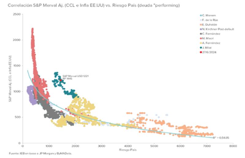 "Existe una marcada y significativa correlación entre el S&P Merval (medido en pesos) y el dólar contado con liquidación (CCL). Sin embargo, es importante señalar que los niveles observados actualmente se encuentran significativamente alejados de dicha correlación", puntualizó.