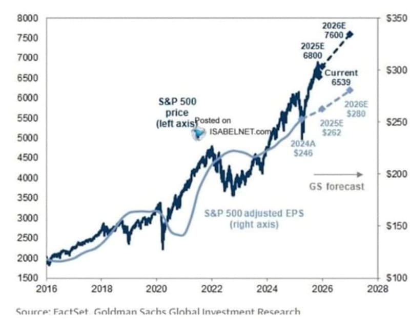 Matías Waitzel, socio de AT Inversiones, indicó que la proyección de Goldman Sachs, que ve al S&P 500 en torno a los 7600 puntos en 2026 (un avance cercano al 15%), encaja con un escenario que sigue siendo constructivo para Wall Street.