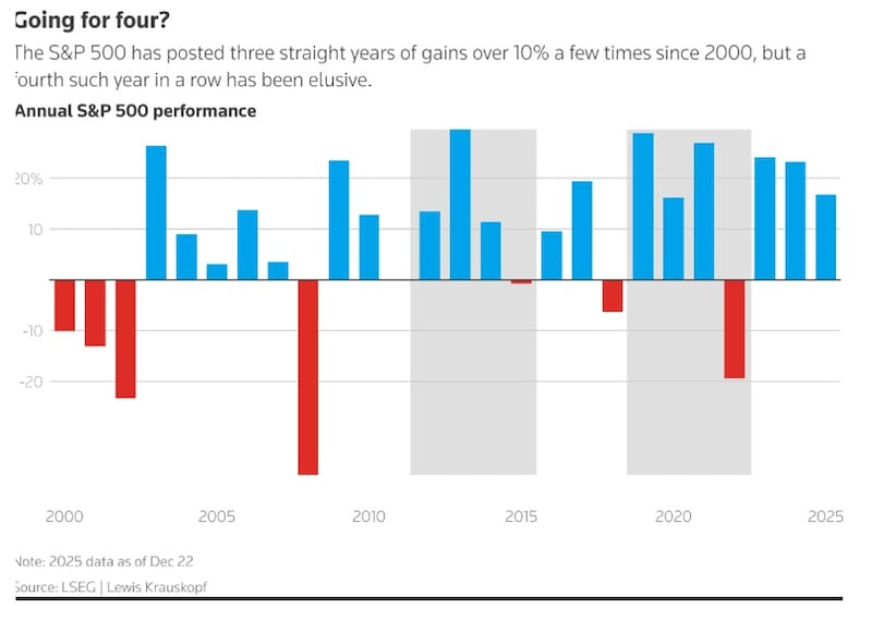 Un cuarto año con ganancias de dos dígitos en 2026 podría resultar desafiante ya que requiere fuertes ganancias, una Reserva Federal moderada y un fuerte gasto en inteligencia artificial.