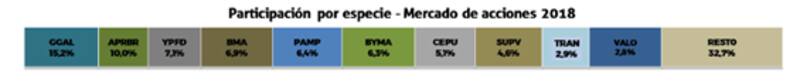 Las 10 especies mas negociadas en 2018 fueron Grupo Financiero Galicia (15,2%), Petrobras (10%), YPF (7,1%), Banco Maco (6,9%), Pampa (6,4%), BYMA (6,3%), Central Puerto (5,1%), Banco Supervielle (4,8%), Transener (2,9%) y Grupo Financiero Valores (2,8%).