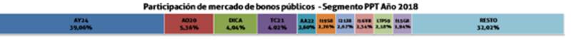 En cuanto al título público más operado en 2018, este fue el Bonar 2024 (AY24). “El Bonar 2024 explicó el 39% del volumen anual y lo siguió el Bonar 2020 (AO20) con el 5,4%. Por su parte, el bono en pesos más negociado fue el TC21 (ajustable por CER), explicando el 4% del total , afirmaron en su informe.