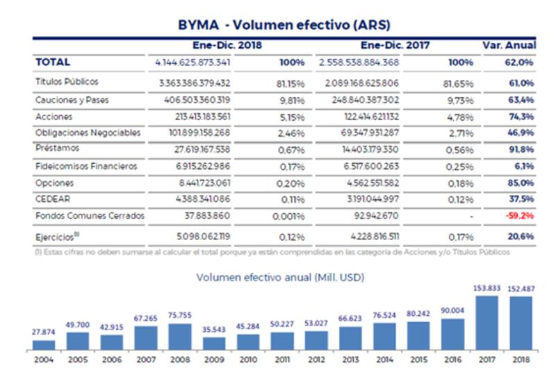 En un informe elaborado por los analistas de BYMA se detalla que el volumen efectivo total, en pesos, creció 62% anual mientras que, medido en dólares cayó 0,9%.