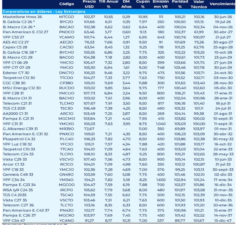 Casos como Pan American 2027 rinde 5,2% en dólares, mientras que YPF a 2027 rinde 6,45%. Los bonos de YPF a 2029 rinden entre 7% y 7,3%, mientras que los títulos a 2031 operan con tasas de 6,9%.