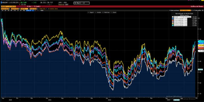 Todos los bonos subieron con fuerza, avanzando entre 27% y 48% desde comienzo de octubre hasta la actualidad, potenciadas por el trade electoral y la victoria de Javier Milei en las elecciones presidenciales.