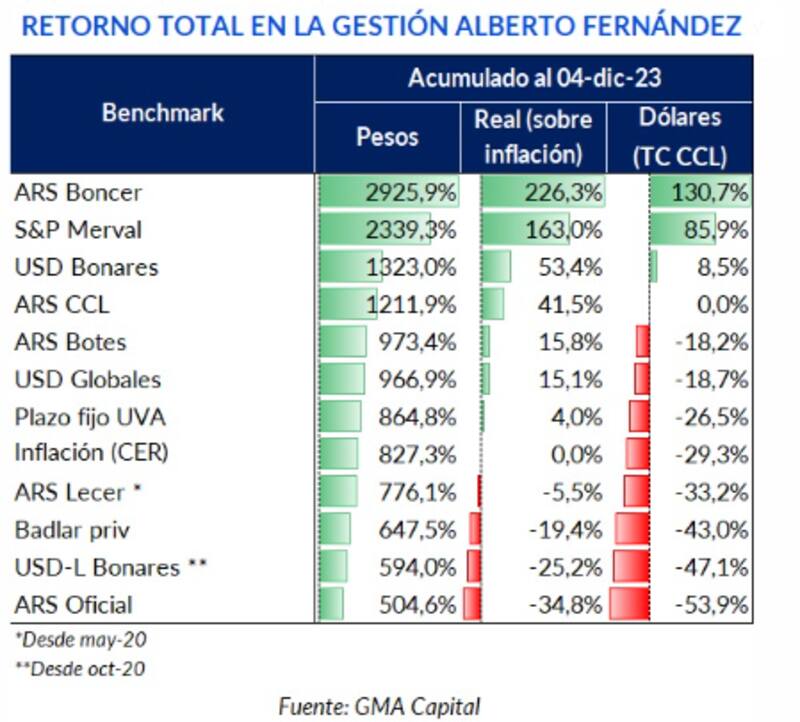 Según datos elaborados por Nery Persichini, head de estrategia de GMA Capital, los activos que subieron más que el CCL durante la gestión de Alberto Fernández fueron los bonos que ajustan por CER, que subieron 2925% en pesos.