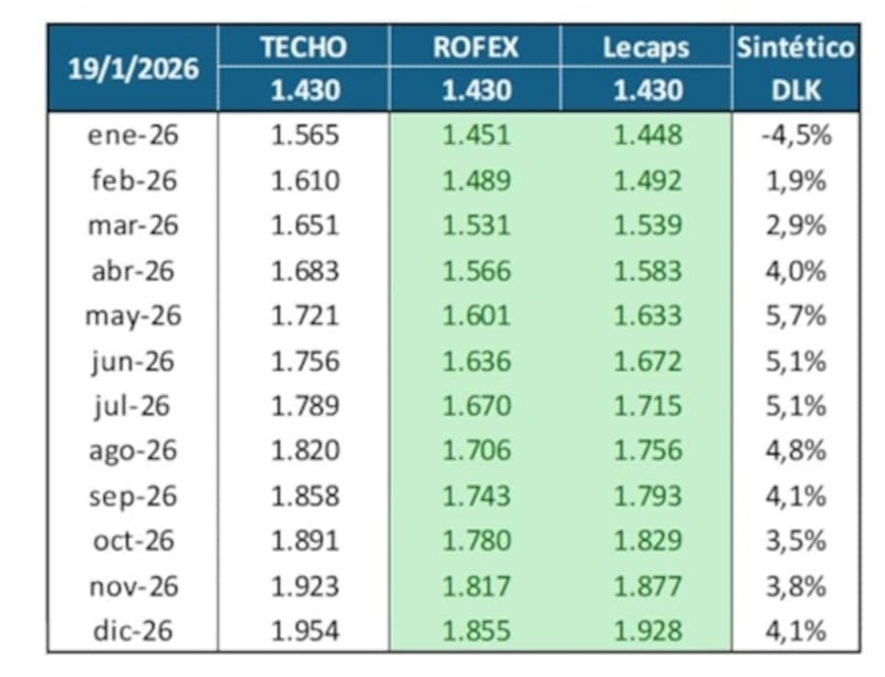 Lo mismo ocurre con las lecap a marzo, que tienen un implícito de $1539, debajo de los $1651 del techo de la banda para el mismo periodo. Para mitad de año, la Lecap a junio cotiza con un break even dólar de $1672, debajo de los $1756 del techo de la banda, según cálculos de Benítez.