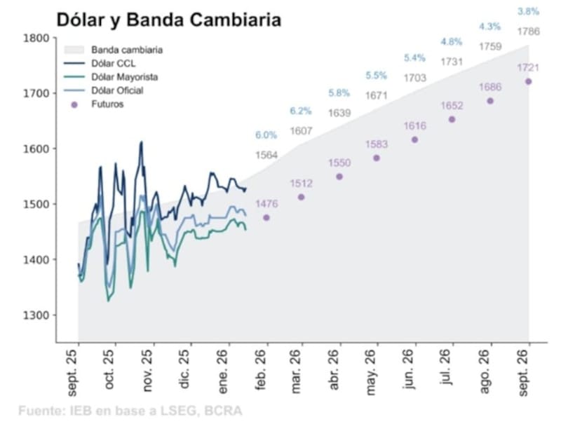 Para fin de febrero, el dólar futuro se ubica en $1512, saltando a $1550 para fin de marzo y $1583 para fin de abril. Finalmente, para septiembre, el dólar oficial alcanzaría los $1721, debajo de los $1786 de la banda superior.