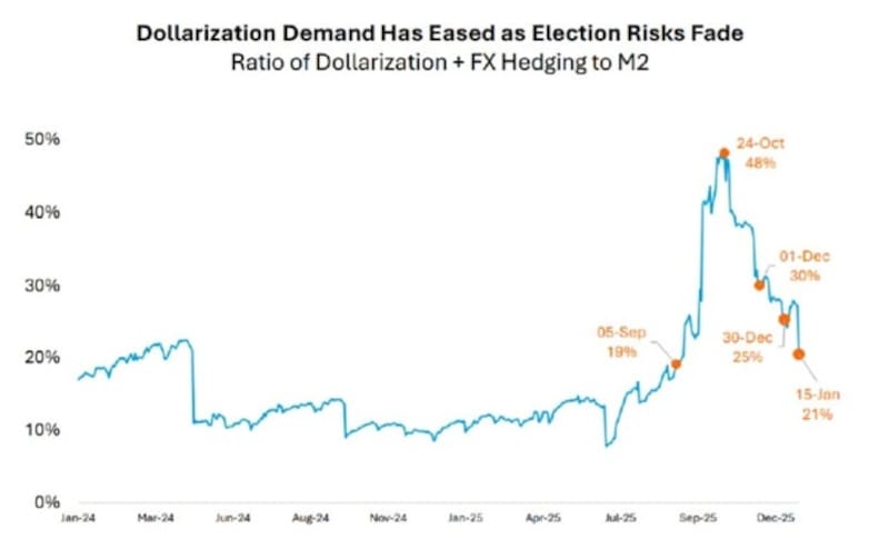 Según detallaron desde Adcap Grupo Financiero, la demanda por cobertura cambiaria alcanza el 21% de la M2, cuando en las elecciones legislativas de octubre, dicho ratio había alcanzado el 48%.