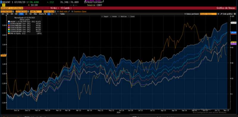 Los bonos argentinos suben entre 9% y 13% en los distintos tramos de la curva, alcanzando nuevos máximos. Sin embargo, los bonos emergentes operaron con pérdidas en el último mes, marcando un descenso de 2%.