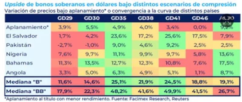 En ese sentido, agregó que "si Argentina converge a la mediana de los créditos "B", el upside en el GD35 y GD41 es del 25%; el cual se duplica al 50% si Argentina converge a la mediana de los créditos ´BB´"