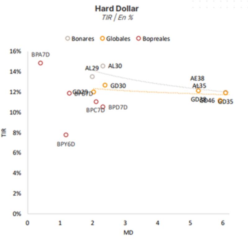 "En las carteras de renta fija en dólares seguimos sobre ponderando soberanos. Priorizamos el GD41 y el GD35 por ser los bonos con mayor convexidad, lo que los vuelve más atractivos en escenarios alcistas; a la vez que cuentan con la ventaja de tener una mayor protección a la baja por ser los instrumentos con menor paridad de la curva", dijo.