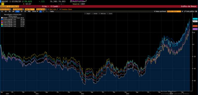 En el tramo medio, los bonos a 2035 y 2038 ganan 78% y 64% respectivamente. Finalmente, los bonos del tramo más largo muestran avances de 66% y 79% en lo que va de 2024.