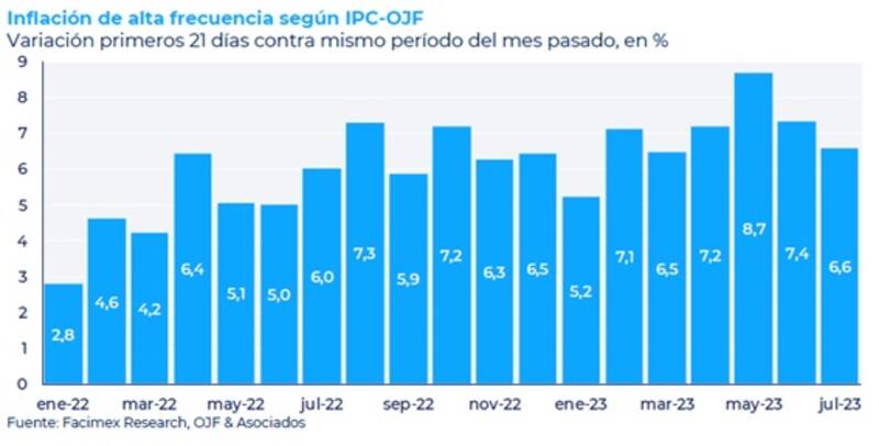 Para los analistas de Facimex Valores, los datos de alta frecuencia sugieren que la inflación de julio se ubicaría en torno a 6,5% mensual, aunque consideran que esta aceleración en el margen y las medidas que tomó el equipo económico esta semana, agregarán presiones sobre la dinámica inflacionaria de agosto.
