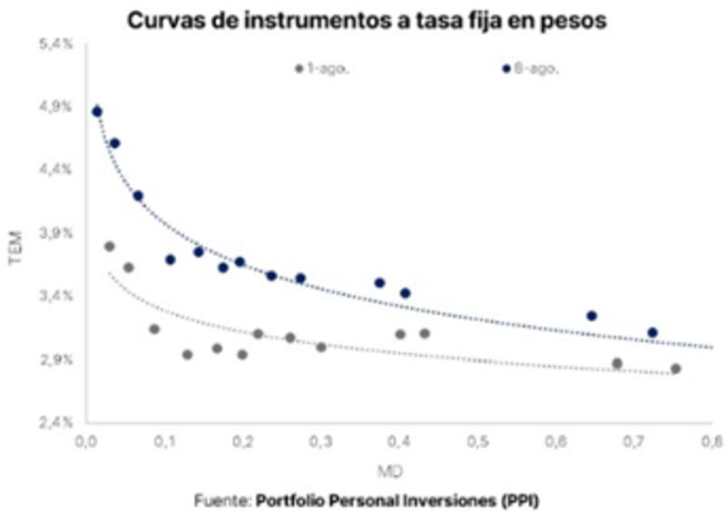 Esto son niveles de tasa por encima de los que se veían a comienzo de la semana pasada, cuando la curva se ubicaba en 3,9% en el tramo más inmediato, y con tasas de 3,4% a 3% en los plazos medios y largos.