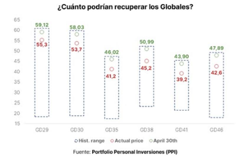 "Asumiendo este lapso, el tramo corto exhibiría el upside más modesto: GD29 (+7%) y GD30 (+8%). Por otra parte, los títulos más largos presentarían subas de entre 11% y 13% para recuperar esos niveles", dijeron desde PPI.