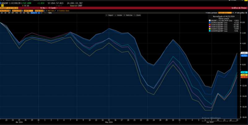 Así, los bonos recuperan parcialmente las pérdidas acumuladas desde abril a la fecha. Aun con el rebote actual, la renta fija local muestra caídas de entre 5% y 10% desde los picos de abril pasado.