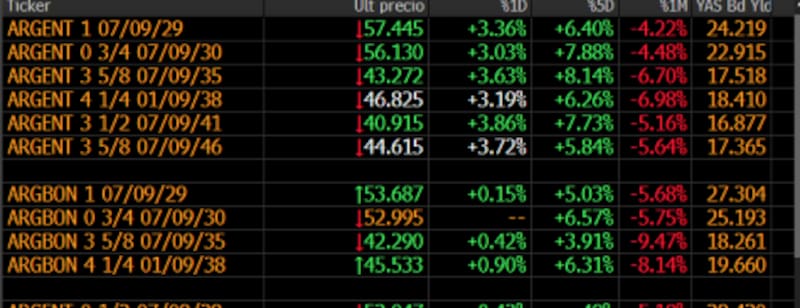 En el tramo medio, los bonos ganan 3,6% y 3,2% en los títulos a 2035 y 2038. Finalmente, los Globales a 2041 y 2046 muestran ganancias de 3,9% y 3,7%.