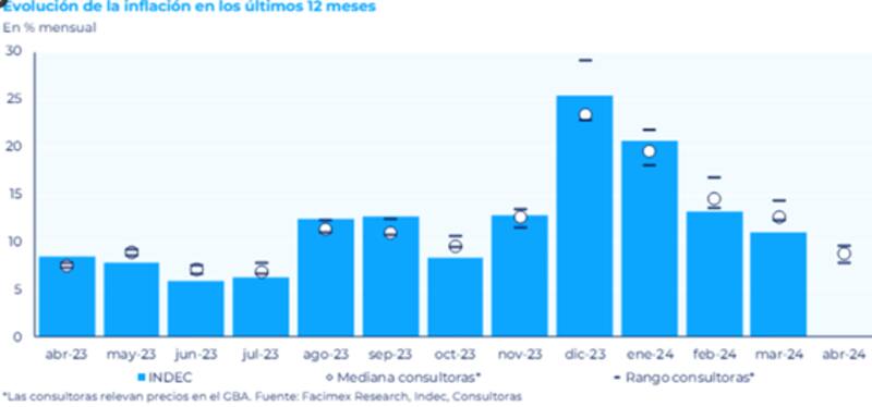La mediana de las mediciones fue del 8,8% mensual en abril, con todas las mediciones reportando por debajo de sus propios registros de marzo y debajo del 11,0% mensual que reportó el Indec para marzo.