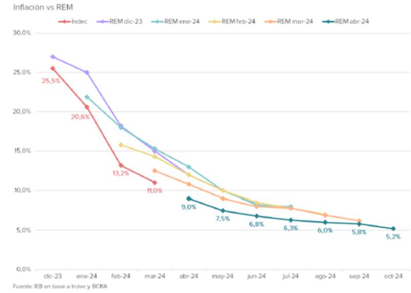 Según los analistas de Grupo IEB, "el mercado espera un fuerte sendero de desinflación, ajustando a la baja sus expectativas respondiendo al "delivery" en materia de datos de inflación y apoyándose en las anclas que muestra el gobierno. Esto es un notable ajuste del gasto público, el freno en seco a la emisión monetaria con bajas de tasas sostenidas, y un ritmo devaluatorio estable sobre el tipo de cambio oficial".