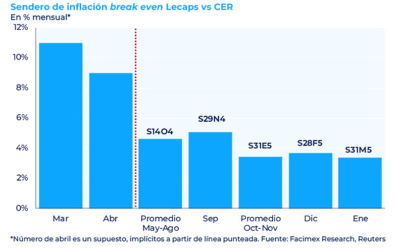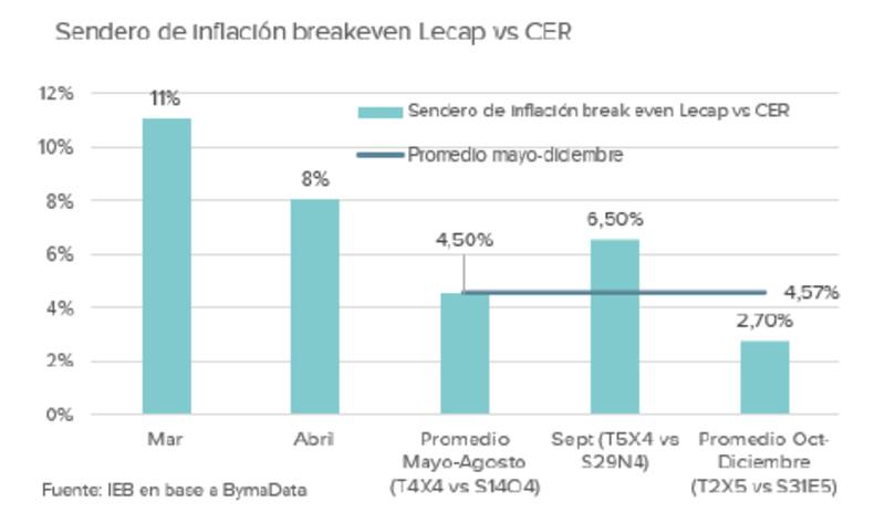 "La inflación break even entre la curva CER y la Lecap es de 4,63% mensual en promedio entre mayo y octubre, asumiendo un 9% mensual de inflación en abril. Nuestro escenario base contempla una inflación promedio del 5% mensual para ese mismo período", dijeron.