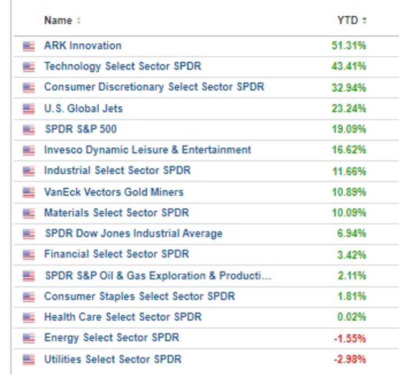 Las ganancias son lideradas por el sector de tecnología de crecimiento a largo plazo (ARKK) que gana 51%, seguido por el sector tecnológico que avanza 43%.