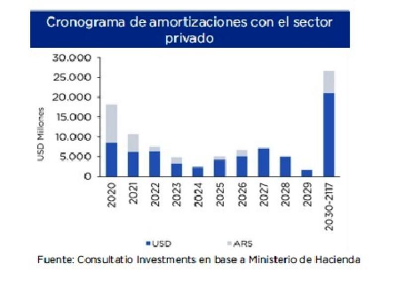 “El 60% de los vencimientos suman u$s 40.000 millones y se concentran en el Bonar 20, Bonar 2024 y el Bonar 2025 (AO20, AY24 y el AA25 de la curva ley local), y los bonos internacionales hasta el 2028. A nuestro entender, estos deberían ser los bonos elegibles para un canje voluntario , afirmó el jefe de estrategia de Consultatio.