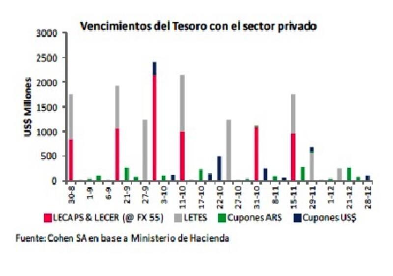 Para los analistas del mercado, el camino hacia fin de año se vuelve muy largo. Preocupan los vencimientos de deuda de acá a diciembre y para ello son clave los próximos desembolsos del FMI. Descontando la participación pública, restan pagar u$s 15.500 millones entre Letes (u$s 6900 millones), Lecap (u$s 5500 millones con dólar a $ 60), cupones de bonos en dólares (u$s 2000 millones) y renta de bonos en pesos (u$s 1100 millones).
