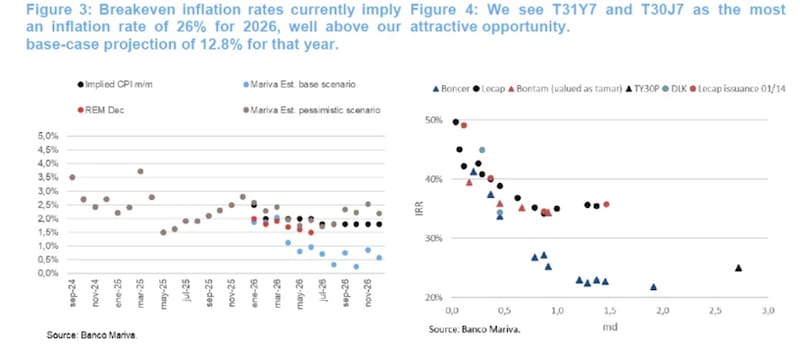 “La curva de Lecaps se mantiene prácticamente plana, con rendimientos que oscilan entre el 2,5% y el 2,9% según la tasa efectiva mensual (TEM). Las tasas de inflación de equilibrio actuales implican una inflación del 26% para 2026, muy por encima de nuestra proyección base del 12,8% para ese año. Consideramos que las Lecaps son más atractivas que los instrumentos vinculados a CER, en particular los bonos de mayor duración como el T31Y7 y el T30J7”, resaltaron.