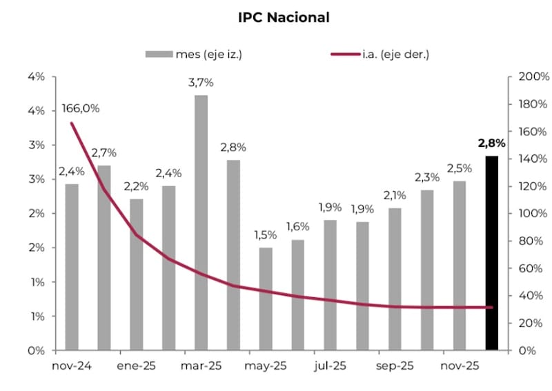 “Nuestro escenario base prevé una inflación promedio del 1,9% en el primer trimestre de 2026 y una inflación anual del 12,8%. No podemos descartar un escenario más pesimista, en el que las expectativas se vean afectadas y la inflación se mantenga estable, lo que mantendría la inflación en un promedio del 2,4% en el primer trimestre y del 29,0% para el año”, estimaron.