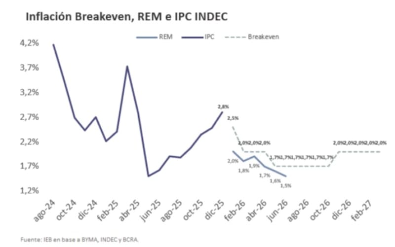 “Los instrumentos a tasa fija corrigieron menos que los bonos CER, lo que derivó en una compresión significativa de las inflaciones implícitas, particularmente en el tramo largo, aun cuando en el muy corto plazo persisten lecturas más elevadas tras el dato de inflación de diciembre”, afirmó.