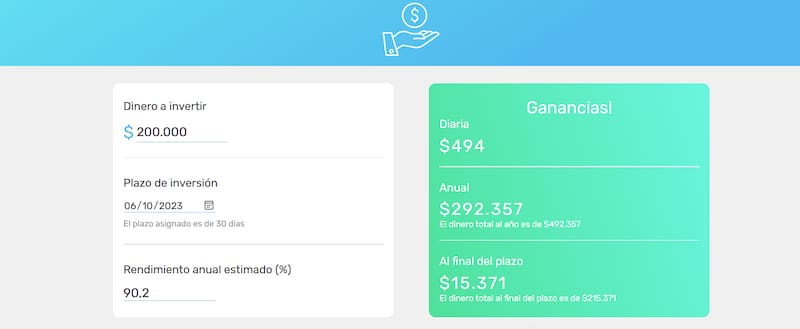 Si bien el porcentaje anual que hará crecer tu dinero va cambiando diariamente, es una buena herramienta para que el dinero no quede sin movimientos. Ahora bien, ¿cuánto dinero puedo ganar si deposito $ 200.000?