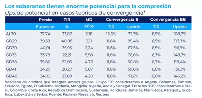 En el ejercicio de Facimex Valores, una convergencia hacia los créditos B implicaría que el GD 29 podría subir 85%. Detrás de este bono se encuentra el GD35, con un upside potencial de 76%, el GD 46 (7,16%), el GD30 (67,5%) y el GD38 (60,8%).