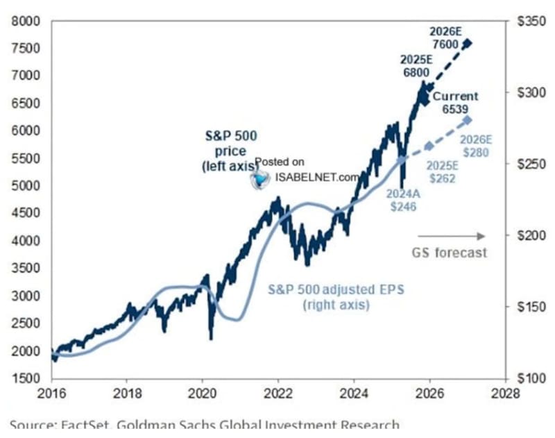 Matías Waitzel, socio de AT Inversiones, indicó que la proyección de Goldman Sachs, que ve al S&P 500 en torno a los 7600 puntos en 2026 (un avance cercano al 15%), encaja con un escenario que sigue siendo constructivo para Wall Street.