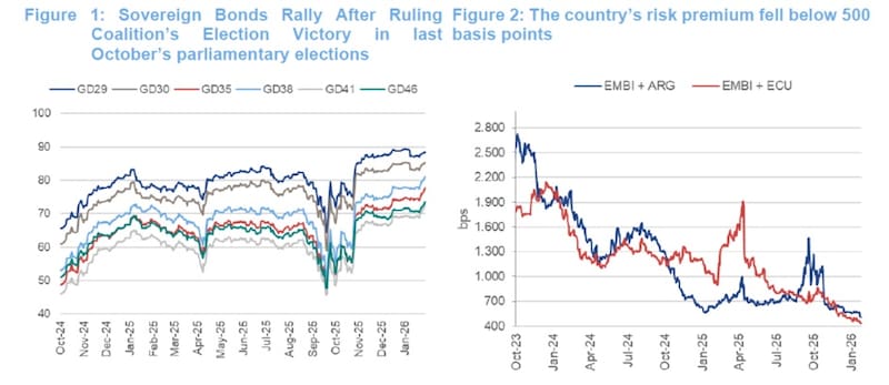 La curva soberana argentina podría comprimir a niveles de 8,2% desde los 8,6% que opera hoy en el tramo medio si se replica el caso de Ecuador, mientras que el tramo más largo podría comprimir hacia 8,6% desde los 9% actuales.