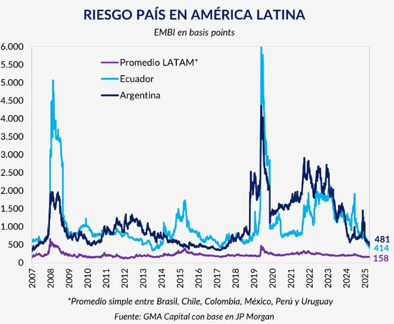 En particular, Ecuador tiene un riesgo país de 414 puntos, mientras que el argentino es de 481 puntos.