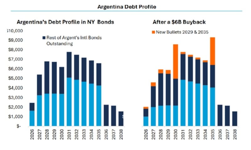 “Luego de Ecuador, el candidato natural para recuperar el acceso al mercado es Argentina. Replicar una estrategia como la de Ecuador tendría beneficios sustanciales para Argentina. Ajustando por los bajísimos cupones de los bonos argentinos a 2029 y 2030, una operación como la de Ecuador aliviaría el perfil de vencimientos en más de u$s 13.000 millones hasta 2030”, estimó Yarde Buller.